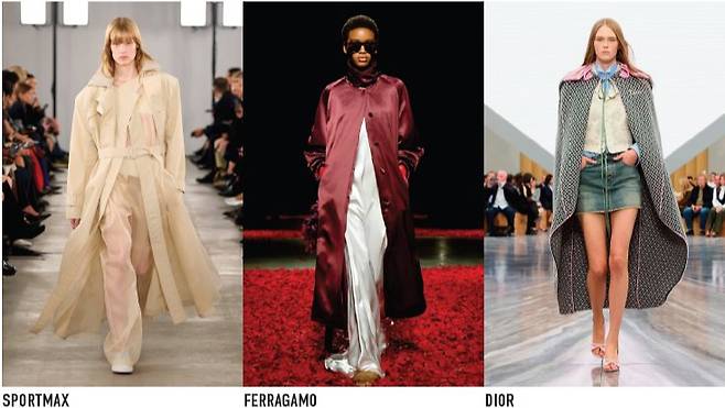 심플한 롱 코트를 갖고 있다면 브랜드의 레퍼런스를 참고해도 좋겠다. 실크 소재의 아우터와 이너의 조합으로 고급스러운 아웃핏을 완성한 페라가모, 레드 컬러 코트 안에 브라운 색상의 재킷을 레이어드한 라코스테 등이 좋은 예다. 발목을 넘는 긴 기장의 코트를 갖고 있다면 팬츠리스 스타일을 시도해보자. 걸을 때마다 은근히 비치는 다리 라인 덕분에 관능미를 뽐낼 수 있다. 이정윤 패션 프리랜서 에디터는 "쇼츠 안에 트렌치코트와 상반되는 색상의 스타킹을 신으면, 컬러와 실루엣의 극적인 대비로 룩이 더욱 스타일리시해 보인다"고 말했다.