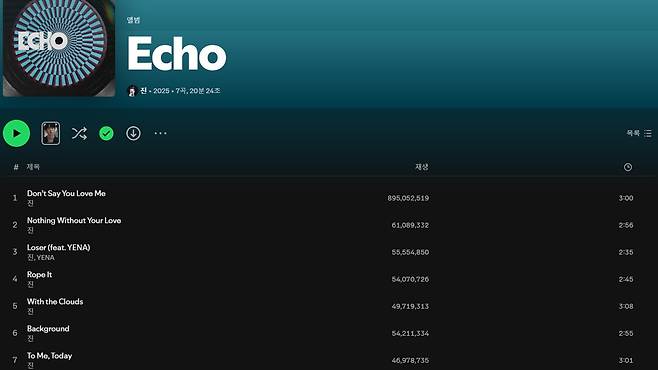 이번 기록은 한 곡만 크게 터진 결과가 아니라는 점에서 더 눈길을 끈다. 앨범 전체가 꾸준히 사랑받고 있다는 뜻이기 때문이다. 타이틀곡 ‘Don‘t Say You Love Me’는 8억9505만 회 이상의 재생 수를 기록하며 ‘Echo’의 흥행을 이끌었다. 감성적인 선율과 절제된 보컬, 이별의 정서를 담은 메시지가 전 세계 청자들의 공감을 끌어낸 것으로 읽힌다.