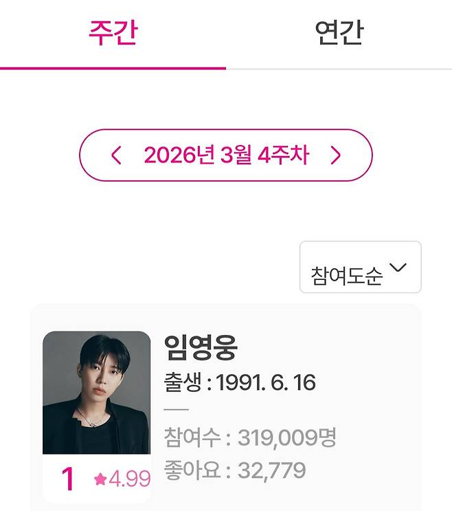 30일 아이돌차트에 따르면 3월 23일부터 3월 29일까지 집계한 3월 4주차 평점랭킹에서 임영웅은 31만9009표를 얻어 최다 득표를 기록했다. 이로써 임영웅은 261주 연속 1위라는 대기록을 이어갔다.