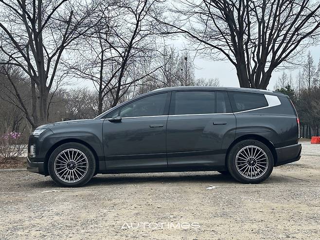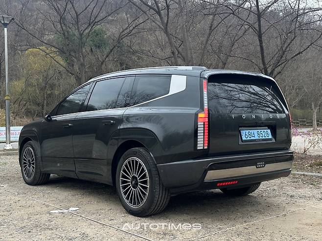 측면은 아이오닉9의 성격을 가장 분명하게 드러내는 부분이다. 실루엣은 전통적인 SUV와는 결이 다르다. 기아 EV9이 박스형 실루엣으로 정통 SUV의 이미지를 강조했다면 아이오닉9은 전혀 다른 방향을 택했다. 공기역학을 중심에 둔 설계다. 긴 휠베이스와 매끈하게 떨어지는 루프라인, 뒤로 갈수록 좁아지는 보트테일 형상은 마치 항공기 동체를 연상시킨다.