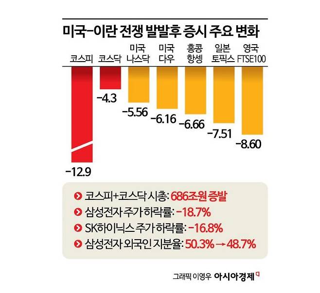 미국과 이란의 전쟁이 발발한 지 한 달이 지났음에도 종전 가능성이 보이지 않으면서 우리 증시에서 시가총액이 686조원 증발했다. 한 달 사이 코스피는 12.9% 하락해 전 세계 주요국 증시에서 가장 큰 낙폭을 보였다. 코스피 대장주인 삼성전자 주가는 18.7% 하락했고, 외국인 지분율도 12년6개월 만에 최저치를 기록했다.