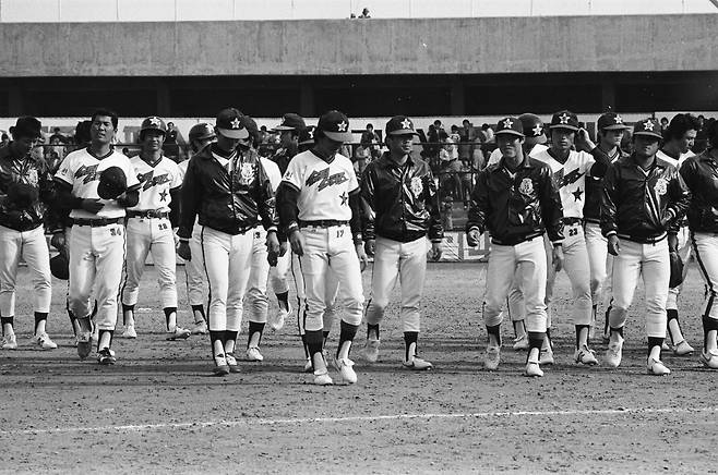 | ▲ 프로야구 삼미 슈퍼스타즈-MBC청룡 경기, 삼미 슈퍼스타즈 선수들의 모습. 1983.4.6. |