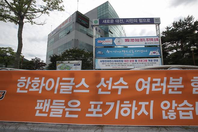 | ▲ 2020년 6월 13일 대전시 중구 한화생명 이글스파크 인근 대전광역시 체육회관 앞 네거리에 당시 18연패중이었던 한화 이글스의 승리를 기원하는 현수막이 걸려 있다. |