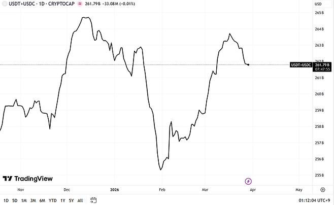 30일 트레이딩뷰에 따르면 USDT와 USDC의 시가총액은 합산은 2617억9000만달러를 기록했다.