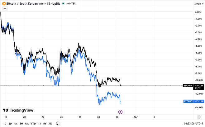 원화값이 하락하면서 국내 거래소인 업비트에서 비트코인의 하락폭이 글로벌 거래소인 바이낸스보다 작게 나타났다.