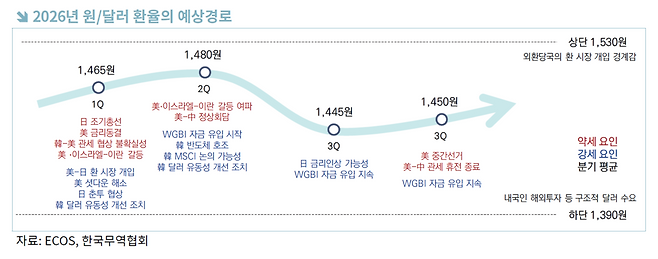 불확실성을 키울 추가 변수는 남아 있다. 11월 미국 중간선거를 앞두고 증시 부양 기대가 확대될 경우 달러화가 재강세로 돌아설 수 있고, 같은 시기 미·중 관세 휴전 종료도 환율 하락 속도를 제한하는 요인으로 작용할 수 있다. 보고서는 분기별 환율 평균을 2분기 1480원, 3분기 1445원으로 제시하고 상단 1530원, 하단 1390원으로 설정했다.