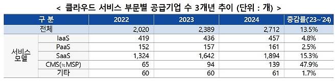 | ▲ 클라우드 서비스 부문별 공급기업 수 3개년 추이 |