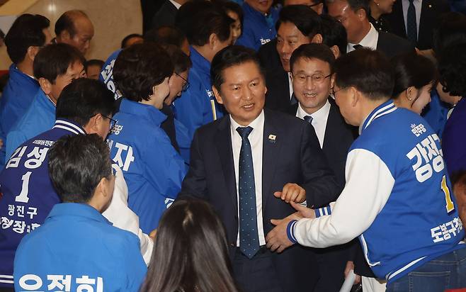 정청래 더불어민주당 대표의 짖궃은 질문에 상인들과 구경꾼들 사이 한바탕 웃음이 터져 나왔다. 30일 민주당은 당대표와 최고위원 등 지도부를 비롯해 전현희·박주민·정원오(기호순) 등 서울시장 예비후보들이 함께 서울 동작구 노량진수산물도매시장을 찾았다. 예비경선 직후 본경선에 진출한 세 후보가 처음으로 한 데 모인 자리였다.