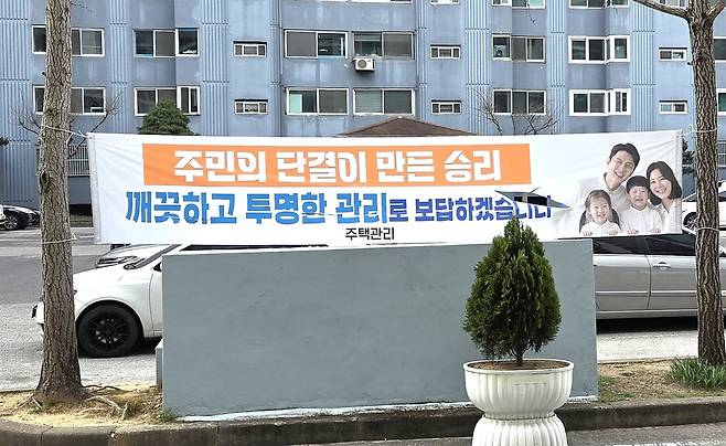 새 관리업체는 가처분 인용 이후 지난 26일께 단지 내 주요 게시 장소에 "입주민 여러분, 저희 ○○관리는 최선을 다해 깨끗하고 공정하게 아파트를 관리하겠습니다"라는 내용의 현수막 여러장을 게시했다.