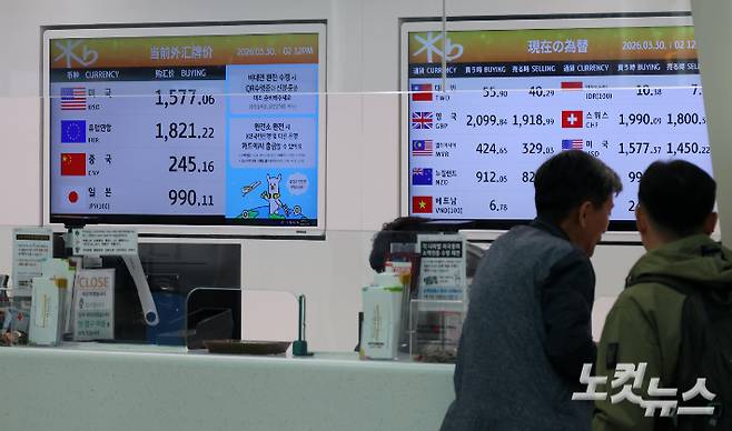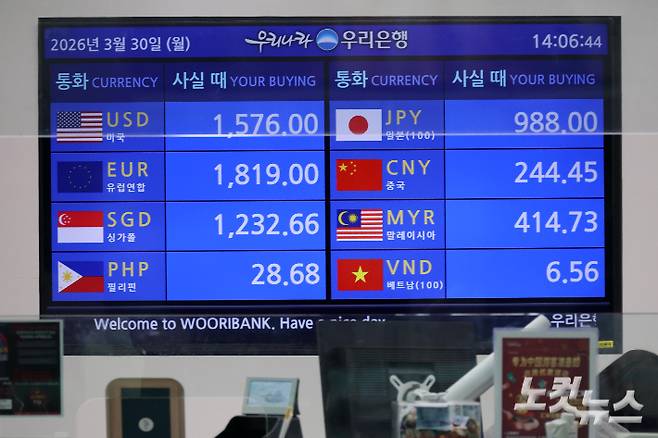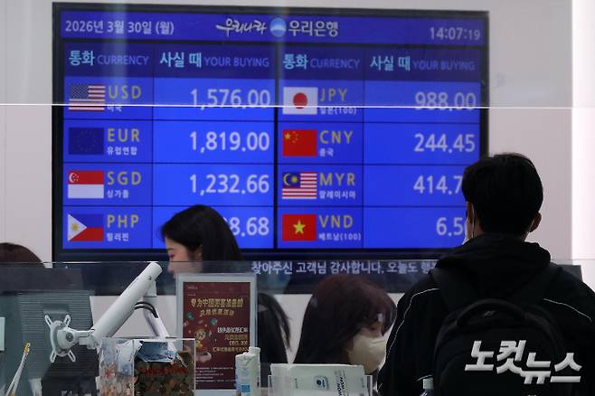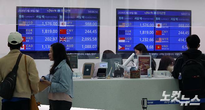 이란 전쟁 확전 우려가 커지며 원·달러 환율이 전거래일보다 4.5원 오른 1513.4원에 출발하며 연 고점을 위협하고 있는 가운데 30일 인천국제공항 환전소에 원·달러 등 각국 환율이 표시되어 있다.