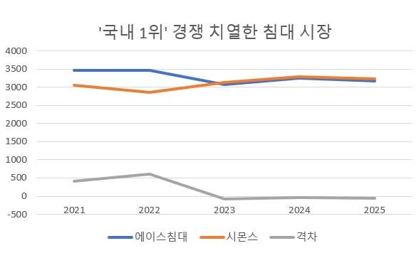 에이스침대는 줄곧 국내 1위를 지키다가 2023년 시몬스에 1위 자리를 내줬다. 에이스침대의 연매출은 2021년 3463억원, 2022년 3462억원, 2023년 3064억원이었다. 2024년엔 3259억원, 지난해엔 3172억원을 기록했다. 같은 기간 시몬스 매출은 3054억원, 2858억원, 3138억원, 3295억원, 3239억원이었다. 두 회사의 매출 격차는 점차 줄어들어 2024년엔 시몬스가 36억원 차이로 1위를 지켰다. 지난해엔 에이스침대보다 67억원 많았다.