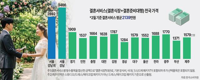 결혼비용을 지역별로 보면 서울 강남이 3466만원으로 가장 비쌌다. 또 강남 외 서울이 2892만원, 경기가 1909만원이었다. 결혼서비스 비용이 가장 낮은 지역은 경상으로, 1284만원이었다.