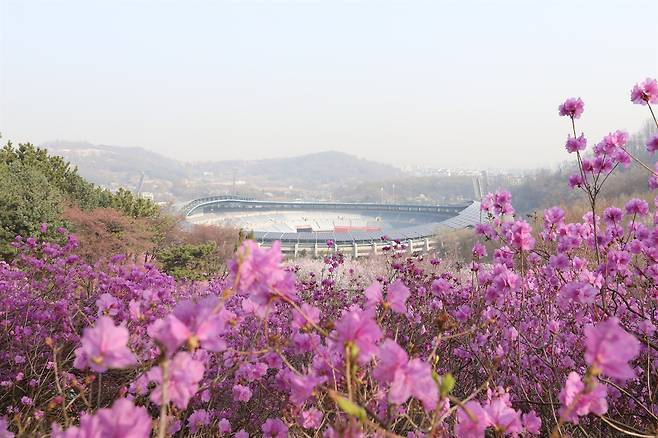 | ▲ 원미산 능선 위, 분홍빛 진달래 사이로 부천종합운동장이 내려다보인다. |