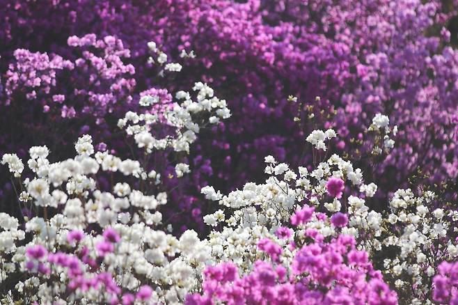 | ▲ 분홍빛 바다 사이 순백의 섬처럼 피어난 흰 진달래 군락이 봄의 위로를 건넨다. |