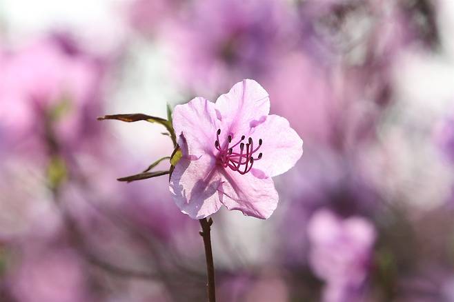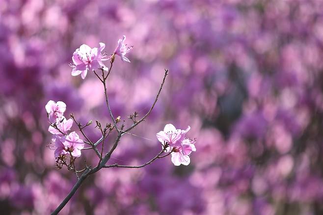 | ▲ 잎보다 먼저 피어난 분홍빛 참꽃, 앙상한 가지 끝에서 투명한 봄의 이야기를 전한다. |