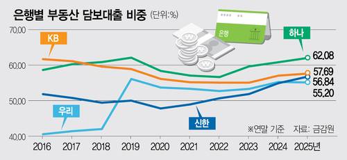 신한은행의 경우 2024년 말 55%에서 지난해 말 56.84%로 1.84%포인트 뛰었다. 전체 대출 잔액(334조 2162억 원) 가운데 부동산담보대출이 189조 9562억 원에 달했다. 하나은행도 같은 기간 60.87%에서 62.08%로 1.21%포인트 상승하며 60%를 넘겼다. 4대 은행 중 유일하게 비중이 줄어든 곳은 우리은행이었다. 2024년 말 55.32%에서 지난해 말 55.20%로 0.12%포인트 낮아졌다. 다만 우리은행은 2016년만 해도 부동산 담보 비중이 40%대였지만 지속적으로 상승하고 있다.
