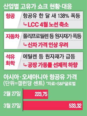 중동발 지정학적 리스크가 촉발한 국제유가 폭등으로 국내 산업계 전반에 '공급망 비상'이 날로 가중되고 있다. 자동차업계에선 원가 상승 압박이 나날이 심해지면서 완성차 판매가격 인상 우려도 커지고 있다. 항공업계에서는 폭증한 항공유 부담에 노선 단축과 비상 경영에 돌입하는 곳이 늘고 있다.