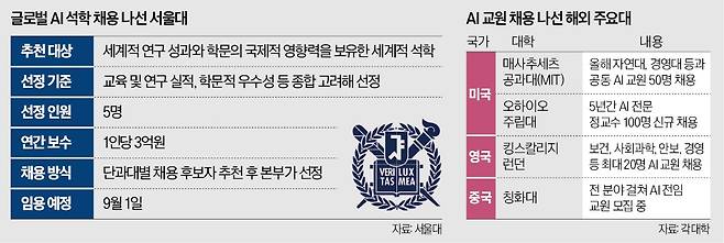 서울대가 각 전공 분야를 망라한 인공지능(AI) 석학을 영입한다. 기존 정교수 대비 두 배 수준의 연봉을 제시해 단과대별로 특별 채용할 계획이다. 세계 주요 대학의 AI 인력 확보 경쟁에 서울대도 뛰어든 모습이다.