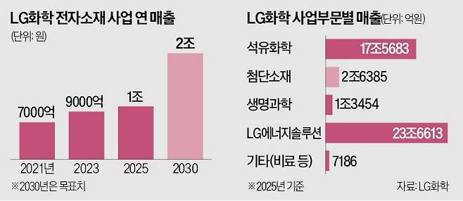LG화학은 지난해 1조원 수준이던 전자소재 사업 매출을 2030년까지 2조원으로 확대하는 것을 30일 목표로 제시했다.