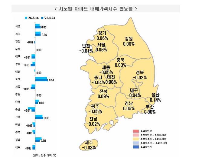 서울(0.06%), 경기(0.06%) 등 수도권은 0.05% 오름세를 보였고, 지방은 보합을 기록했다. 전국 17개 시·도 가운데 상승 지역은 울산과 전북(0.09%), 경남(0.05%), 충북(0.03%) 등 6곳에 그쳤다.