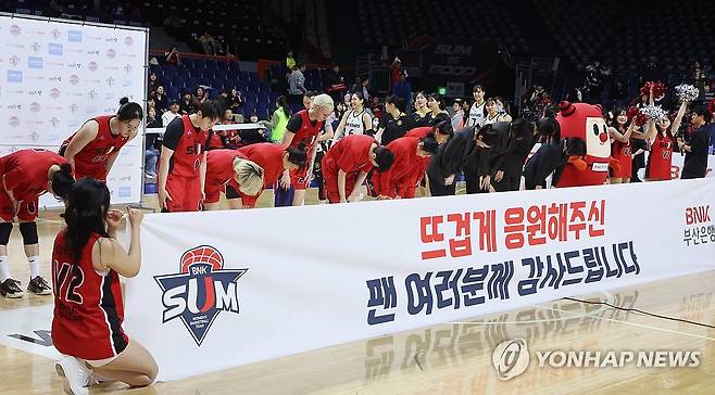 (부산=연합뉴스) 강선배 기자 = 30일 부산 사직체육관에서 열린 2025~2026 여자프로농구 부산 BNK 썸과 청주 KB스타즈의 정규리그 마지막 경기. BNK 썸 선수들이 경기를 마치고 팬들에게 인사하고 있다. 2026.3.30