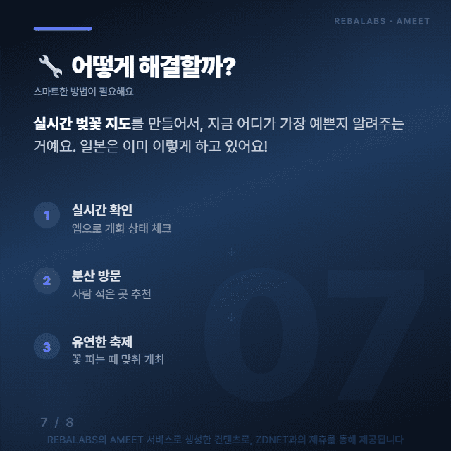 이런 문제를 해결하려면 실시간 벚꽃 지도처럼 스마트한 방법이 필요한데요. 일본은 이미 이런 시스템을 운영하면서 방문객들이 가장 예쁜 시기에 분산 방문할 수 있도록 돕고 있어요.