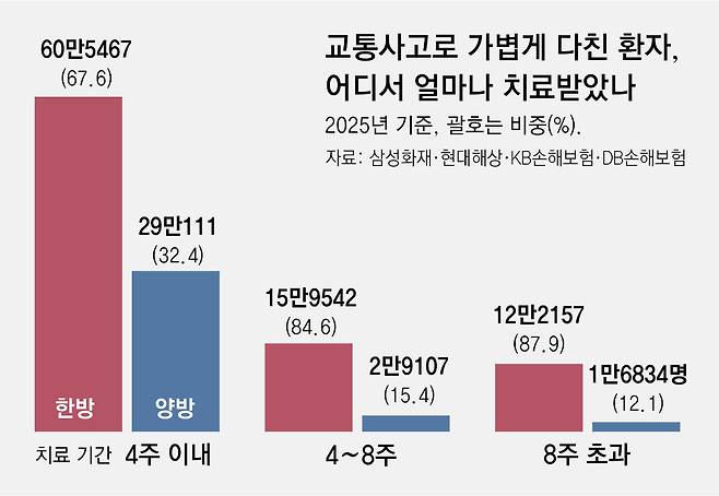8주를 넘겨 치료받은 환자 중에서는 한방 환자 비율이 훨씬 높았다. 보험업계는 장기 치료가 사실상 한방 중심으로 이뤄지는 구조라고 지적한다. 8주를 초과해 치료받은 경상 환자 중 13만8991명(87.9%)이 한방 환자였다. 양방 환자의 95%는 4주 이내에 치료를 마쳤다. 보험업계는 이 같은 구조가 보험금 지급 증가로 이어져 보험료 인상 요인으로 작용하고 있다고 보고 있다.