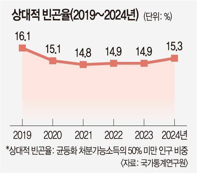 상대적 빈곤율은 2024년 15.3%로 전년보다 0.4% 포인트 증가했다.