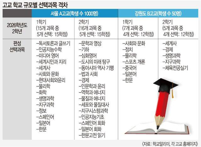 선택권 격차는 전국적 현상이다. 교육부에 따르면 12개 학급 이하 소규모 고교의 경우 학생이 3년 다니며 평균 84.5개 과목을 배운다. 13~24개 학급 규모는 97.2개, 25학급 이상에선 99.3개다.