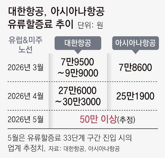 대한항공 미주 노선 기준 3월 발권 시 편도 약 10만 원 수준이던 유류할증료는 4월엔 약 30만 원, 5월에는 50만 원 이상으로 급등할 전망이다.