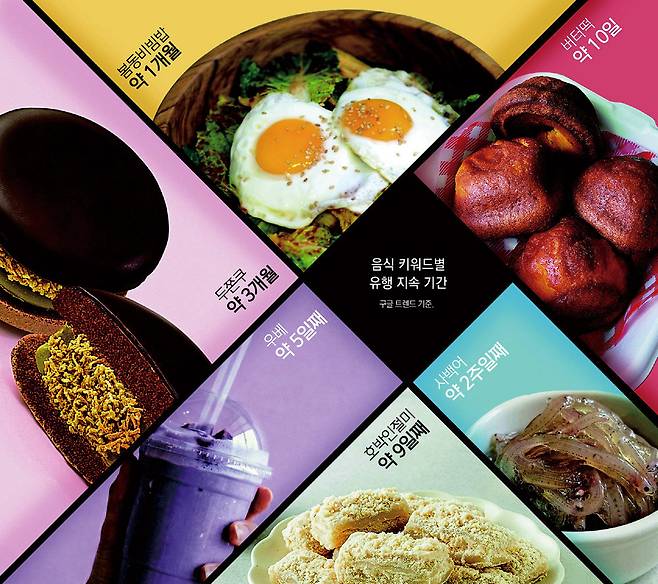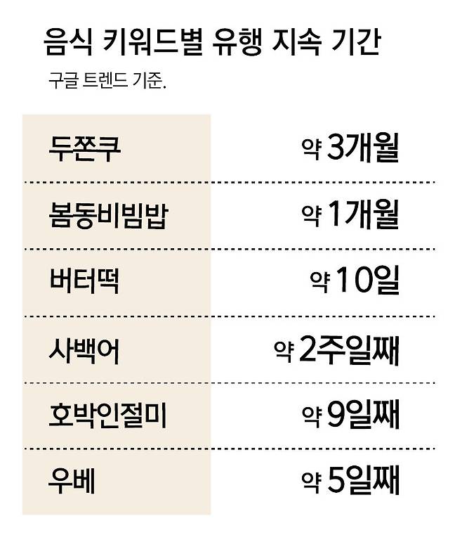 소셜미디어를 봐도 그 흐름이 확연히 드러난다. 구글 트렌드에 따르면 두쫀쿠는 약 3개월 만에, 봄동비빔밥은 약 1개월 만에 검색량 추이가 큰 폭으로 떨어졌다. 창억떡과 우베는 각각 이달 20일과 25일부터 검색량이 폭증했으나, 그 주기는 더 짧아질 것으로 보인다.