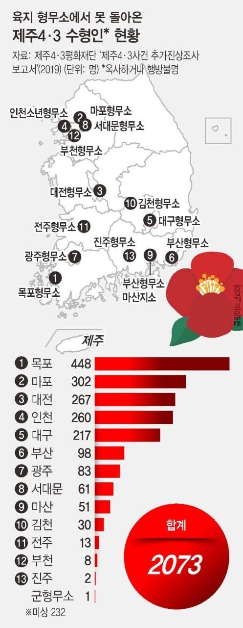 그나마 김천과 전주에 묻힌 것으로 추정되는 4·3 수형인 유해는 적은 편이다. 전남 목포(448명), 서울 마포(302명), 대전(267명), 인천(260명), 대구(217명) 형무소 행방불명자들은 각각 수백명이다. 이런 상황 속에 진실화해위, 지자체, 민간단체의 노력에도 불구하고 제주로 돌아온 4·3 수형인 유해는 지금까지 7구뿐이다.