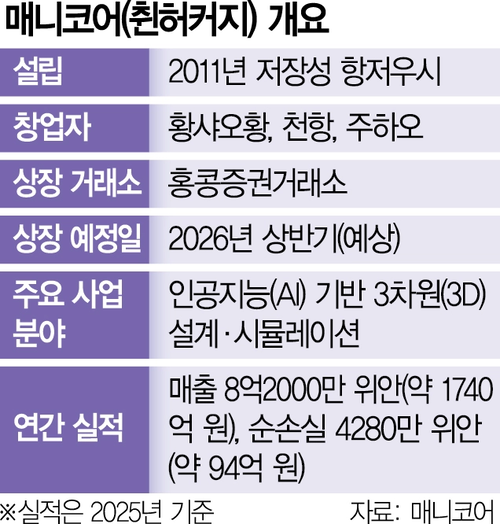 2011년 저장대 영재 출신 황샤오황이 설립한 매니코어는 가정용 인테리어 설계 소프트웨어로 출발해, 공장·창고 등 실내 공간을 가상으로 복제하는 디지털 트윈 플랫폼으로 영역을 확장해 왔습니다. 최근에는 로봇과 AI 에이전트를 가상 공간에서 대량 훈련하는 서비스로 사업 범위를 넓히고 있습니다. 지난해 매출은 약 1740억 원으로, 비(非)국제회계기준 기준으로는 흑자 전환에 성공했습니다. 매니코어는 2021년 미국 상장을 시도했으나 앤트그룹·디디추싱 사태 등의 여파로 중단한 바 있어 이번 홍콩 상장은 그간의 숙원을 이루는 의미도 있습니다.