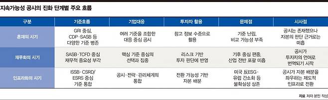 첫째, 기준이 병존하던 혼재의 시기다. ‘글로벌 리포팅 이니셔티브(GRI)’를 중심으로 외부 영향 보고 흐름이 자리 잡는 한편 지속가능회계기준위원회(SASB), 탄소정보공개프로젝트(CDP), 기후변화 관련 재무정보공개 협의체(TCFD) 등 국제 기준이 동시에 등장했다. 공시는 영향 중심으로 구성되어 재무적 중요성은 부각되지 못했고, 기업은 여러 기준을 조합하는 대응 중심 접근을 취했다. 정보는 축적되었으나 투자 판단에 직접 활용하기엔 한계가 있었다.