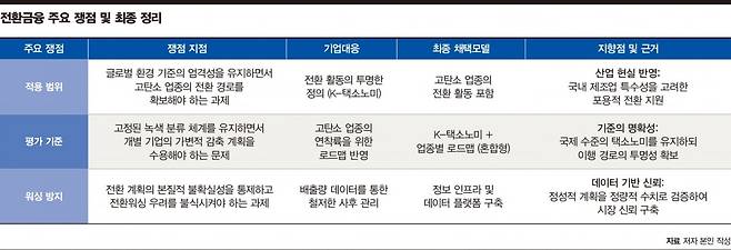 한국형 전환금융의 출발점은 명확했다. 이미 친환경인 산업이 아니라, 탄소 감축이 시급한 고탄소 산업에 자본을 어떻게 연결할 것인가라는 질문이다. 이 과정에서 핵심 쟁점은 전환범위 설정, 평가방식, 기업신뢰성 세 가지로 요약되며, 주요 내용은 아래와 같다.