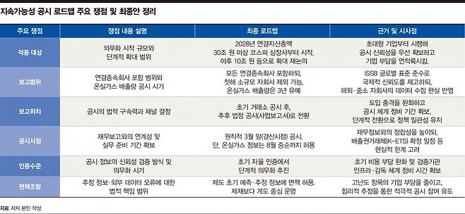 이번 공시 기준 확정과 의무화 로드맵은 그동안 시장에 누적된 불확실성을 해소하고 자본시장 구조를 명확히 정리했다는 점에서 의미가 크다. 기업은 보다 명확한 방향성 아래 준비를 진행할 수 있게 됐다. 다만 이 로드맵은 단순한 기준 설정이 아니라, 기업 수용성과 국제 정합성 사이의 균형을 둘러싼 논쟁 속에서 설계됐다. 주요 논점은 아래와 같다.