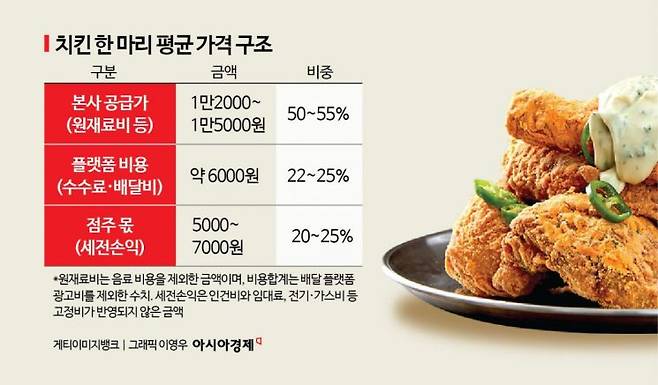 치킨 한 마리 가격은 본사 공급가, 배달 플랫폼 수수료, 점주 몫으로 나뉜다. 본사와 플랫폼이 가져가고, 점주는 마지막에 남은 몫을 가져가는 방식이다.