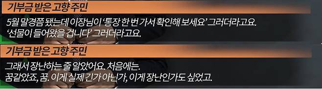 ★기부금 받은 고향 주민 : 5월 말경쯤 됐는데 이장님이 통장 한번 가서 확인해 보세요. 그러더라고요. 선물이 들어왔을 겁니다. 그러더라고요. 그래서 장난하는 줄 알았어요. 처음에는. 꿈 같았죠, 꿈. 이거 실제 긴가 아닌가 이게 장난인가도 싶었고 농촌에 살다 보면 빚도 지는 사람도 많고 돈도 필요하지만 이런 걸 가득 짊어지고 있는데 그때 말하자면 논에서 벼 같은 것을 한 짐 짊어지고 일어나지 못 해요. 그럴 때 뒤에서 누가 밀어주면 잘 일어난단 말입니다. 딱 그런 기분이에요. 저는 시방. 그리고 꿈을 꾸고 있는 것 같아요.