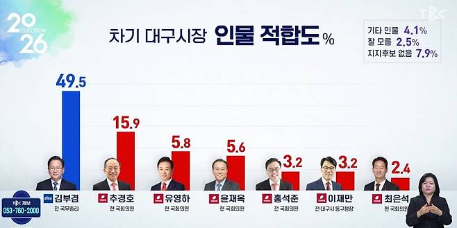 대구경북 민영방송인 TBC가 여론조사기관 리얼미터에 의뢰해 지난 28일과 29일 양일간 대구에 거주하는 만18세 이상 남녀 804명을 대상으로 여론조사를 실시한 결과, 차기 대구시장 인물 적합도 질문에서 김 전 총리는 49.5%로 나타났다.