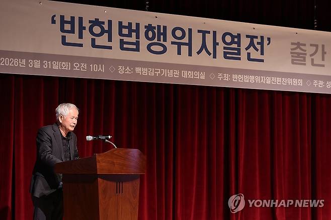 (서울=연합뉴스) 류효림 기자 = 서중석 교수가 31일 서울 용산구 백범김구기념관에서 열린 '반헌번행위자열전' 출간 기자회견에서 인사말을 하고 있다. 2026.3.31