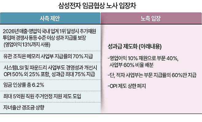 ▶노조 요구안 적용시 지급률 떨어지고 비메모리 사업부 불리해져=삼성전자에 따르면 노조는 교섭 초기 초과이익성과급(OPI) 제도 투명화와 상한 폐지를 전제로 ‘영업이익 15%를 재원으로 부문 70%, 사업부 30% 비율 배분’을 요구했다.