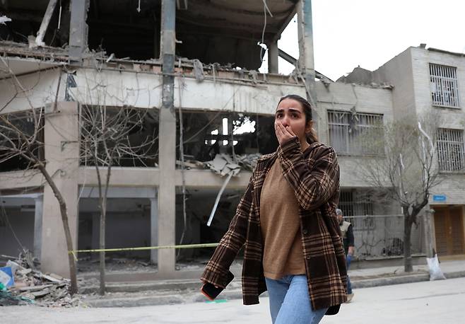 | ▲ 이란 테헤란 북부에서 발생한 공습 이후 카타르 알 아라비 TV 사무실을 포함한 상업 건물 인근의 피해 상황을 한 사람이 지켜보고 있다. 2026.3.29 |