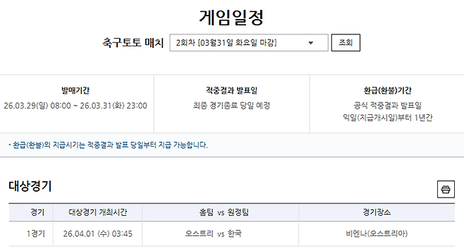 서울올림픽기념국민체육진흥공단(이사장 하형주)이 발행하는 체육진흥투표권 스포츠토토의 수탁사업자인 한국스포츠레저㈜가 오는 4월 1일(수) 오전 3시 45분부터 비엔나(오스트리아)에서 열리는 대한민국(원정)-오스트리아(홈)를 대상으로 한 프로토 승부식 40회차 게임을 발매 중이다.