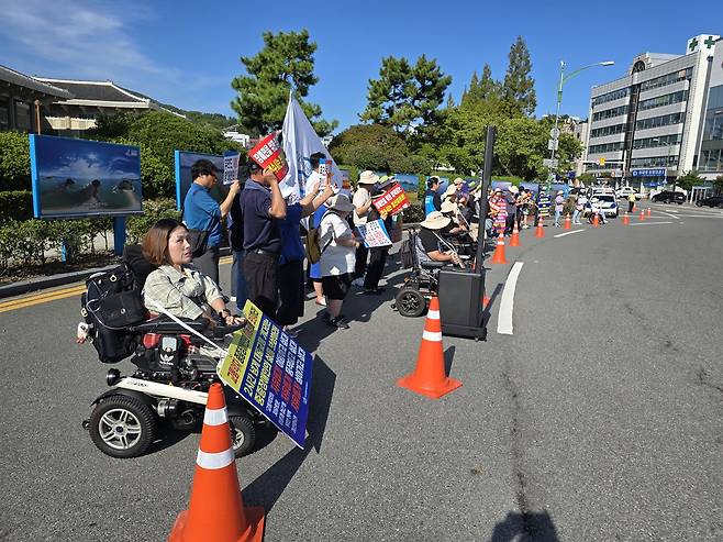 | ▲ 라르쉬장애인자립생활센터를 비롯한 여수지역 장애인 단체가 지난해 9월 4일 오전 8시 여수시청 로터리에서 장애인 기본권 보장을 촉구하고 있는 모습이다. |