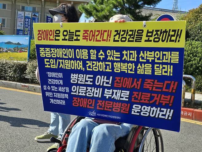 | ▲ 지난해 9월 4일 현장 참가자들은 “장애인은 오늘도 죽어간다! 건강권을 보장하라” 등 구호가 적힌 피켓을 들고 목소리를 높였다. |