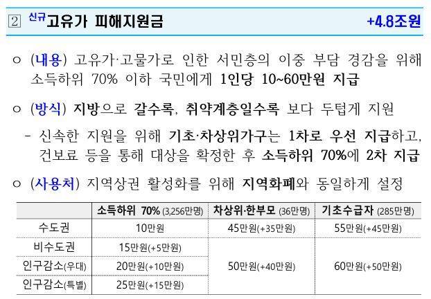 소득 하위 70% 이하 국민 약 3577만 명에게 1인당 10만~60만 원의 고유가 피해지원금을 주는 내용이 담긴 추가경정예산(추경)안이 31일 국무회의를 통과했다.