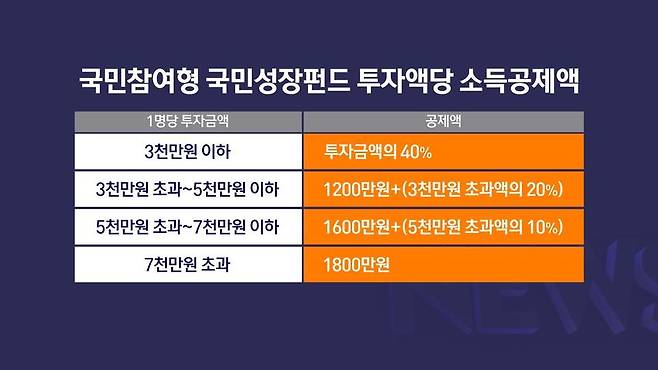 국민참여형 국민성장펀드의 소득공제 혜택은 현재 국회 재정경제기획위원회 조세소위원회에서 논의되고 있는 안도걸 의원안 대로 확정될 경우 투자금액의 최대 40%까지 주어집니다. 투자금이 3000만원 이하인 구간에 대해서는 40%의 소득공제율이 적용됩니다. 이에 따라 2000만원을 투자하면 800만원, 3000만원을 투자하면 1200만원의 소득공제를 받게 됩니다. 최대 투자 한도는 2억원입니다.