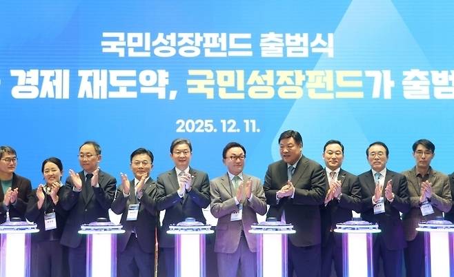 [11일 서울 여의도 산업은행에서 열린 국민성장펀드 출범식에서 박상진 한국산업은행 회장(왼쪽 네번째부터), 이억원 금융위원장과 박현주 미래에셋 회장, 서정진 셀트리온 회장 등이 기념 세리머니를 하고 있다. (사진=연합뉴스)]