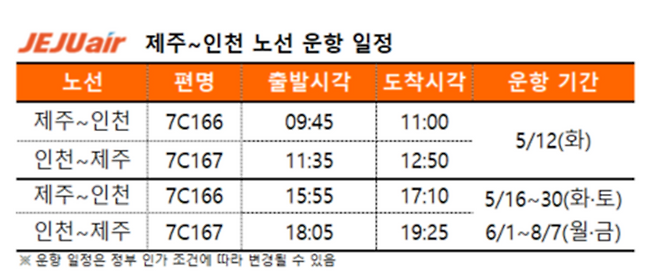 제주항공은 8월 7일까지 약 3개월간 인천~제주 노선을 주 2회 운항합니다.