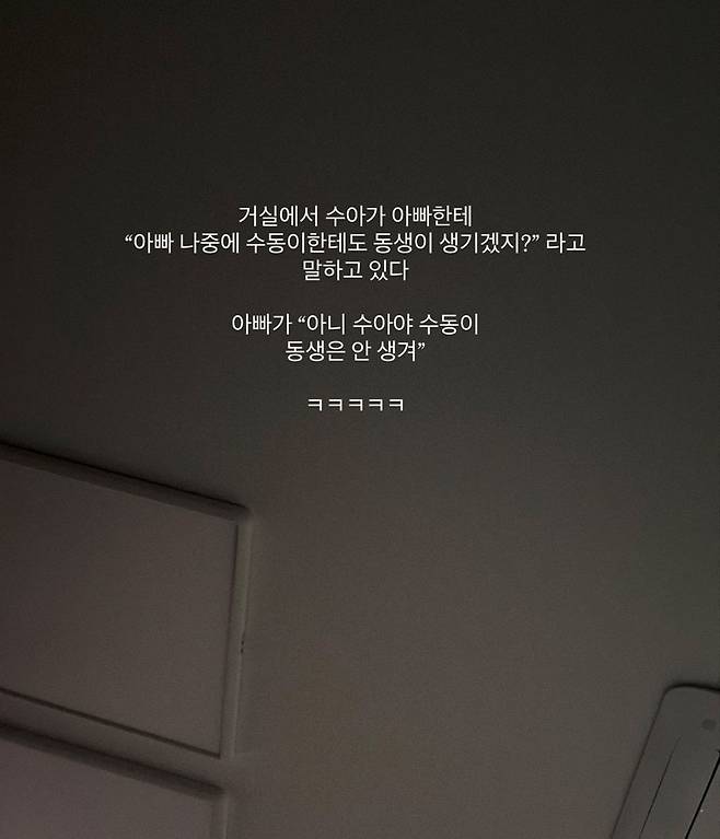31일 김소영은 "거실에서 수아가 아빠에게 '아빠, 나중에 수동이한테도 동생이 생기겠지?'라고 말하고 있다"는 글과 함께 거실 천장 사진을 공개했다. 이어 "아빠가 '아니, 수아야 수동이 동생은 안 생겨'라고 답했다"며 당시 상황을 전해 웃음을 자아냈다.
